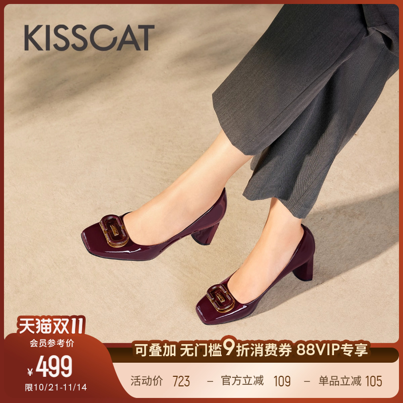 KISSCAT接吻猫方头法式红色单鞋真皮粗跟高跟鞋女气质高级不累脚