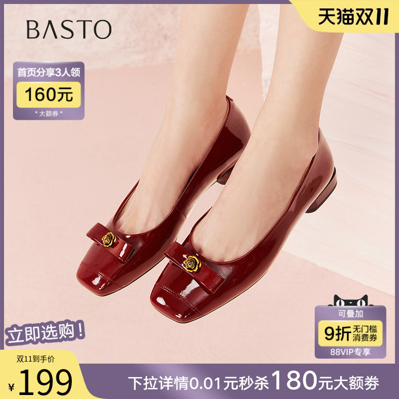 百思图2025春新款通勤方头粗跟浅口女红色单鞋一脚蹬船鞋RE726AQ5