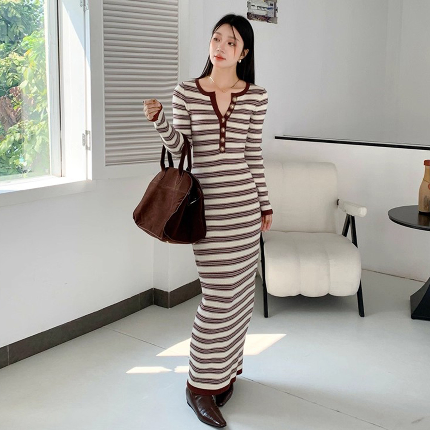 复古别致单排扣条纹针织连衣裙女2025冬季新款修身显瘦包臀长裙子