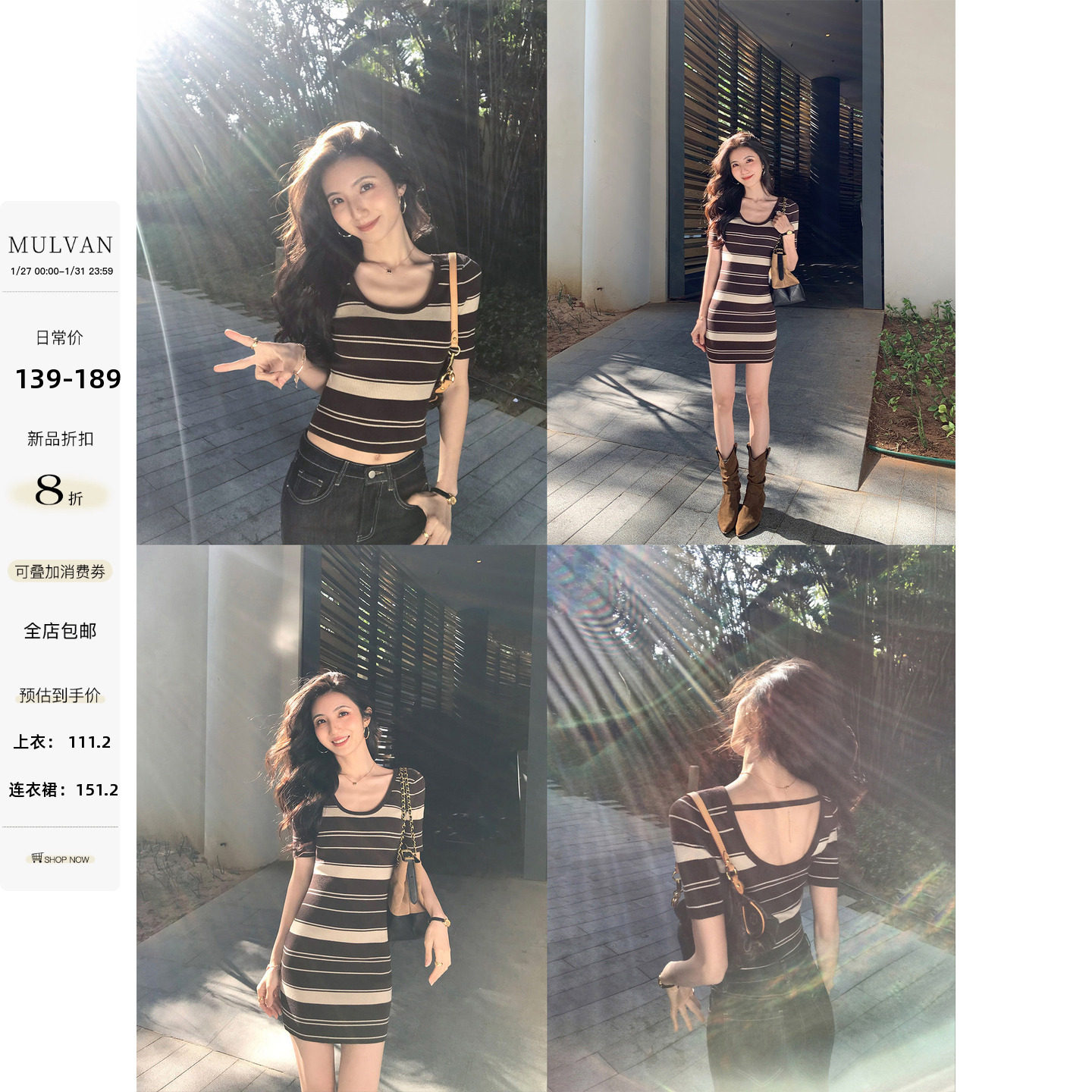 MULVAN 榛果夹心 复古条纹U领短袖连衣裙女露背修身气质包臀短裙