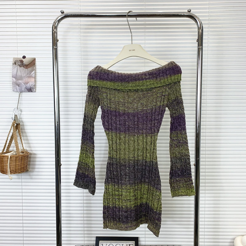 一字肩针织条纹连衣裙女秋季修身长袖裙子纯欲风辣妹收腰包臀短裙