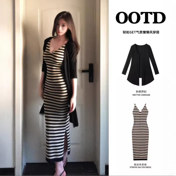 条纹吊带连衣裙女秋冬季御姐修身包臀裙长裙子加开衫两件套装穿搭