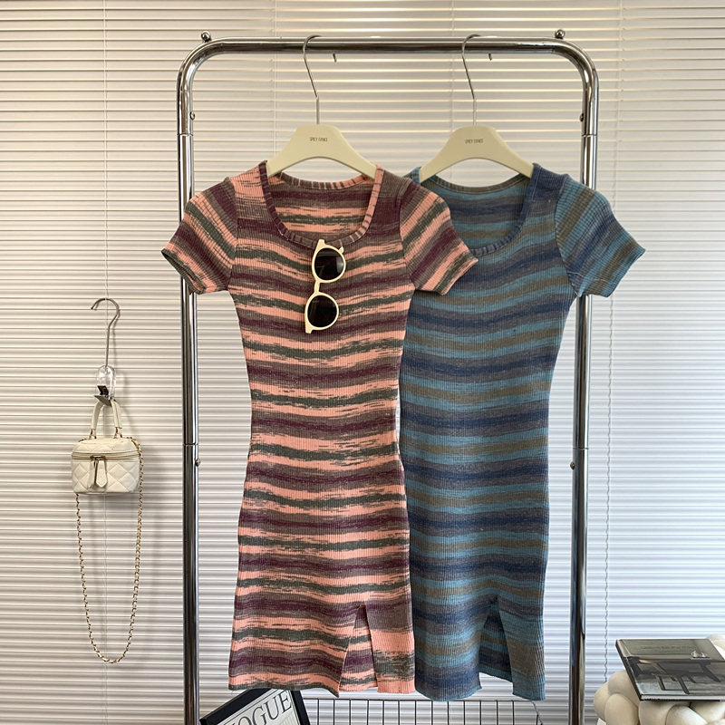 慵懒风条纹短袖针织连衣裙女夏季修身性感开叉包臀裙纯欲风T恤裙