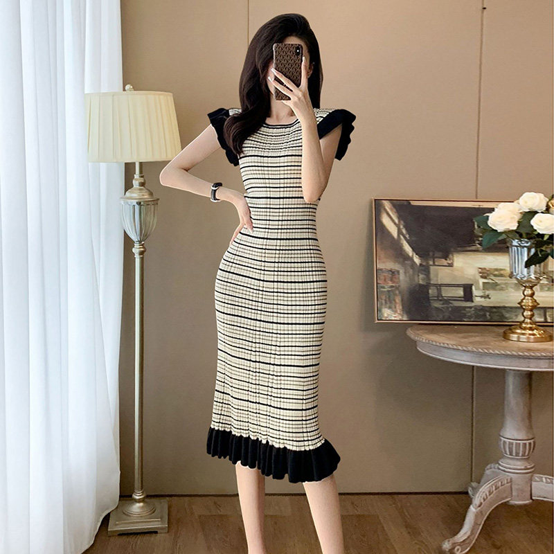 法式小香风条纹连衣裙女高级感飞飞袖修身显瘦针织荷叶边包臀裙夏
