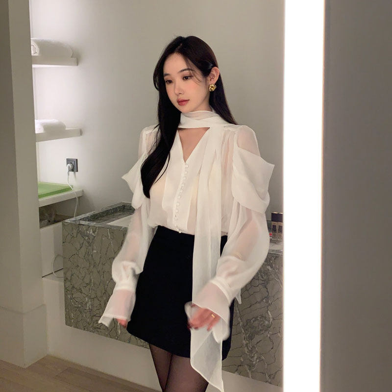 法式高级感洋气气质百搭长袖挂脖V领别致薄款雪纺衫衬衫上衣女潮