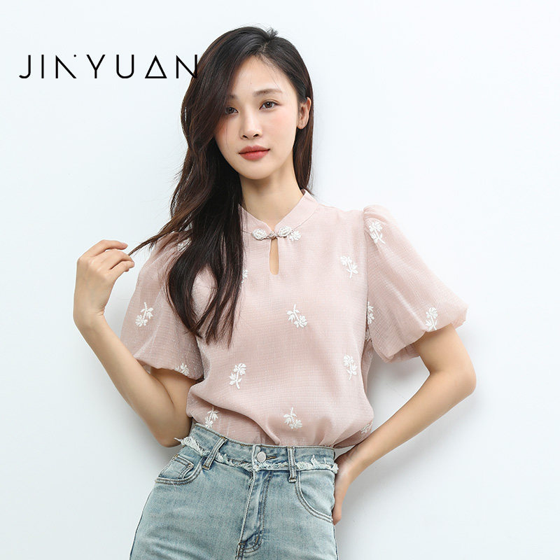 金苑雪纺衫衬衫上衣女夏季新款泡泡袖国风改良旗袍式A232132