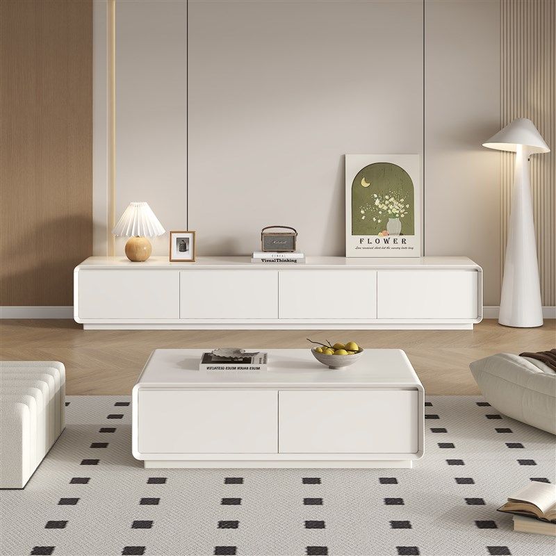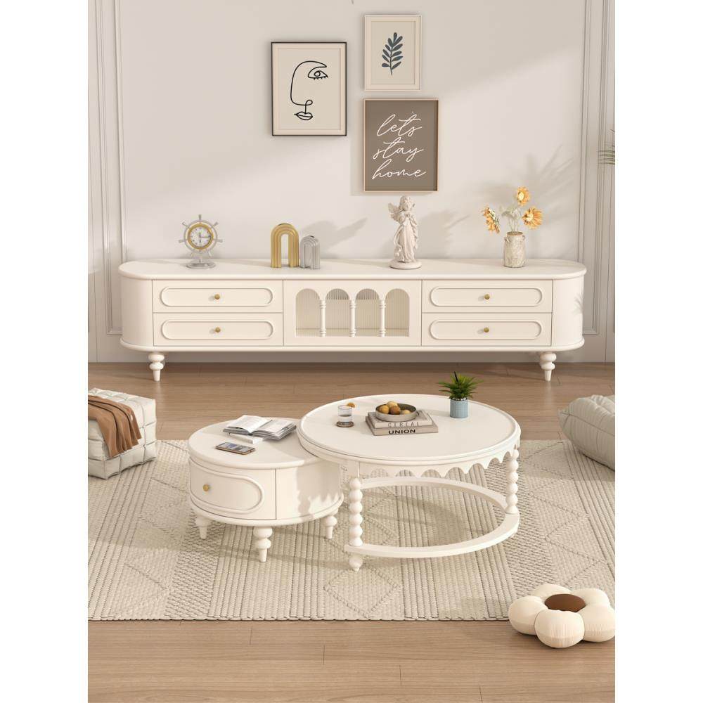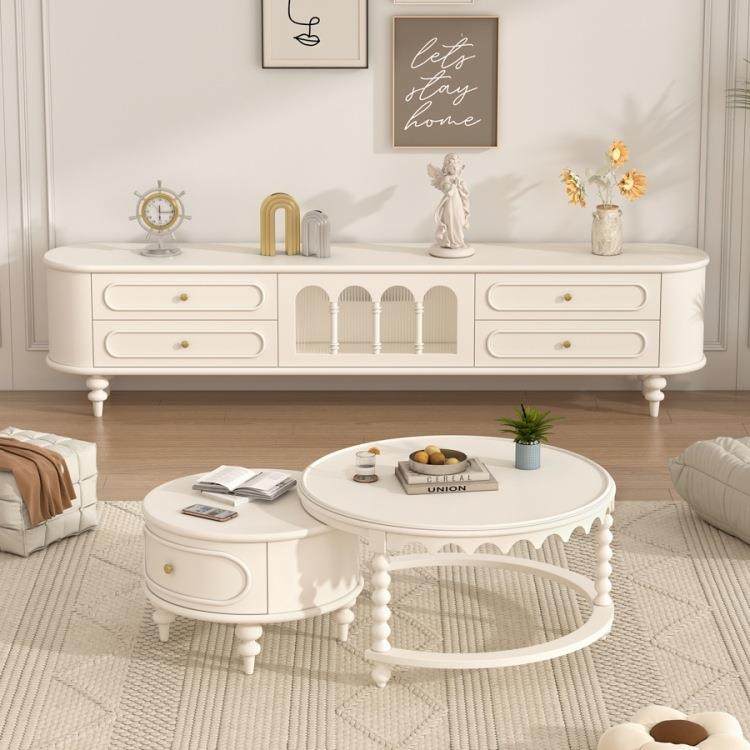 实木烤漆电视柜茶几组合北欧奶油风白色简约现代圆角电视茶几组合