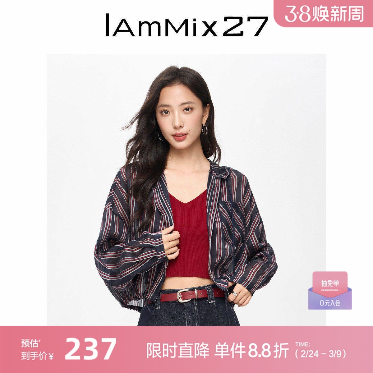 IAmMIX27休闲抽绳连帽薄外套女百搭撞色条纹莱赛尔混纺亚麻上衣女