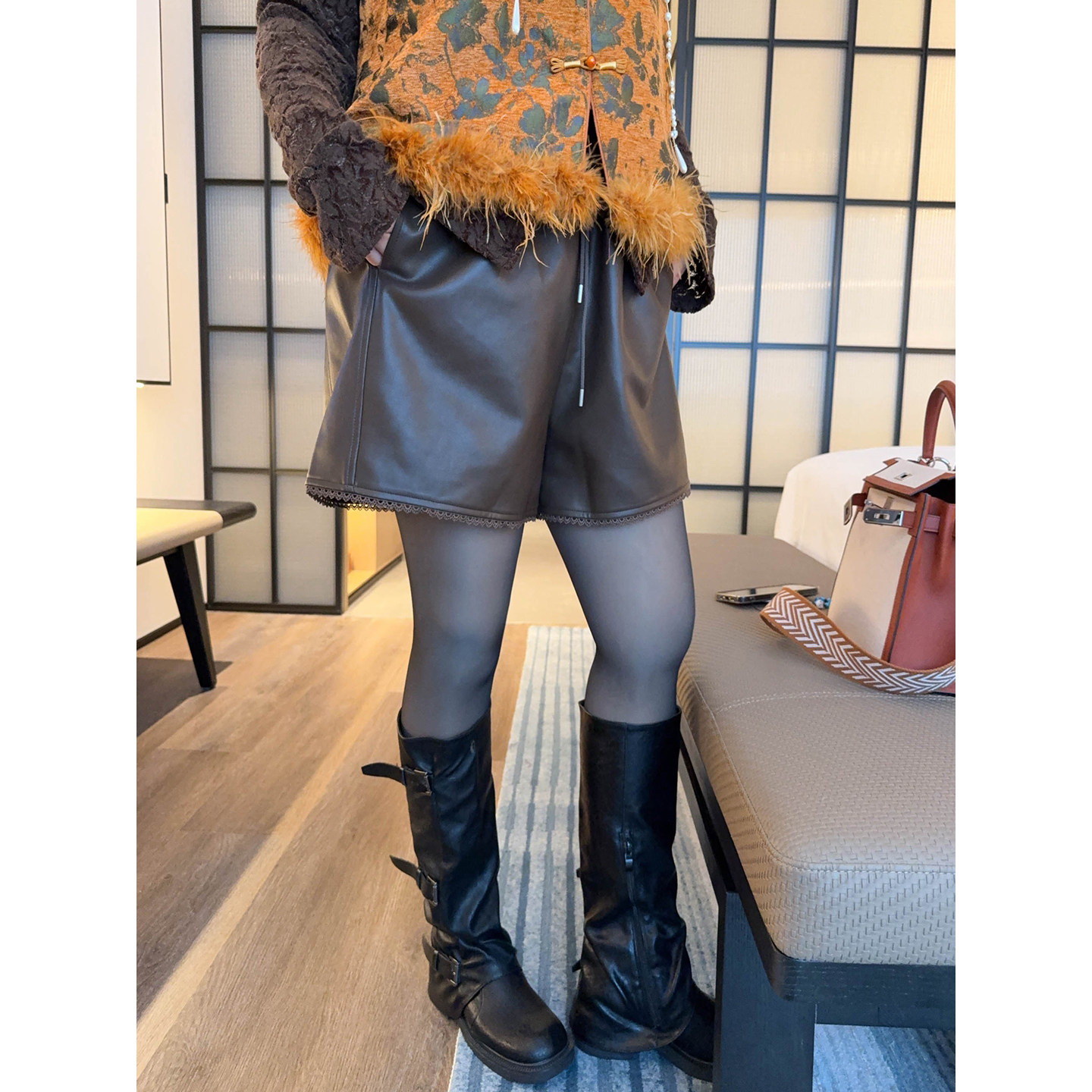 辣妹风咖色PU皮短裤女秋冬2025新款老钱风阔腿裤子修身直筒热裤子