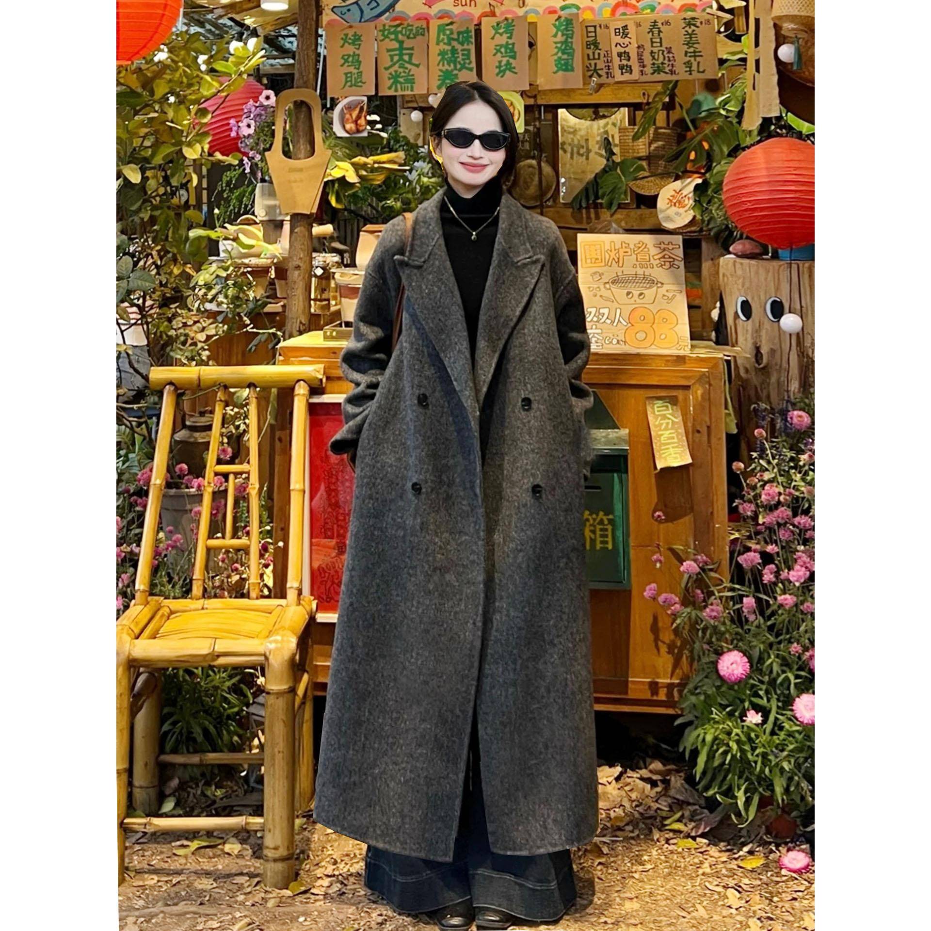 黑灰色高个子加长款双面羊绒大衣女秋冬季新款到脚环羊毛呢子外套