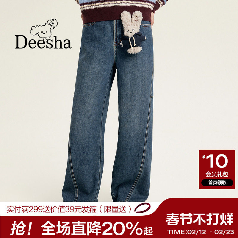 笛莎官旗青少年女孩加厚牛仔裤子2025冬季新款加绒显瘦复合老爹裤