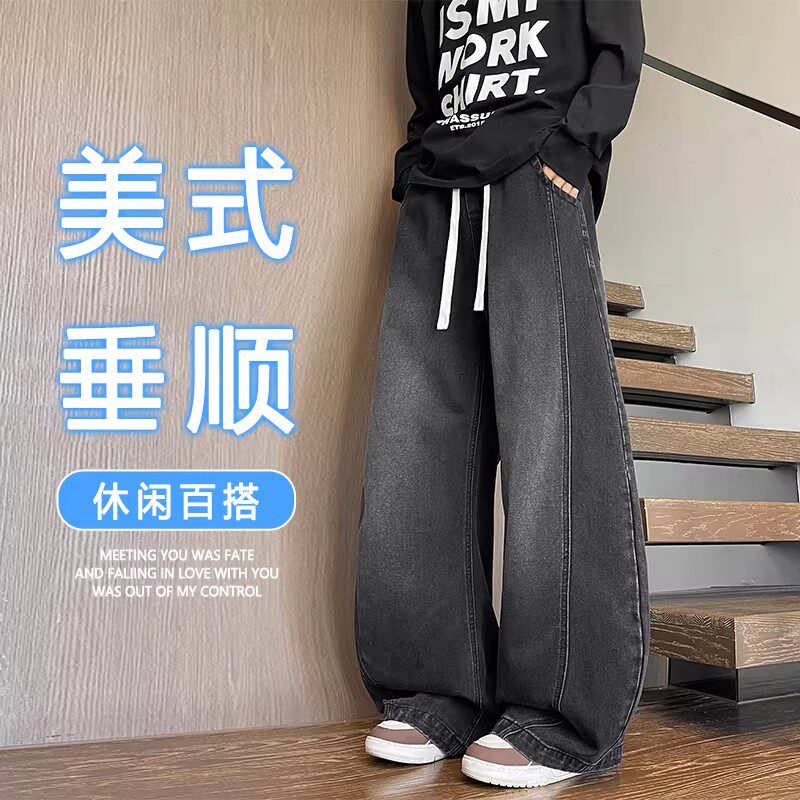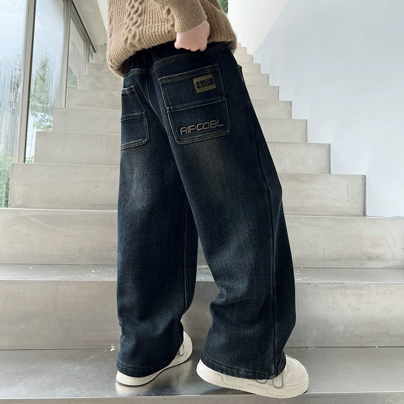加绒牛仔裤男款春秋款青少年男生宽松阔腿裤子男大童休闲直筒长裤