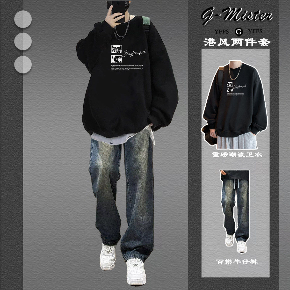 连帽卫衣男加绒套装学生冬季长袖搭配加绒牛仔裤青少年休闲两件套