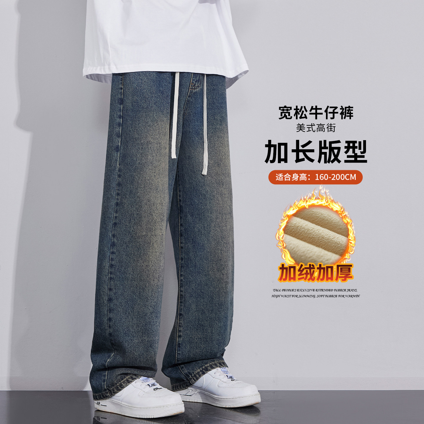 加长牛仔裤子男款秋冬加绒宽松青少年休闲直筒显瘦美式加厚阔腿裤