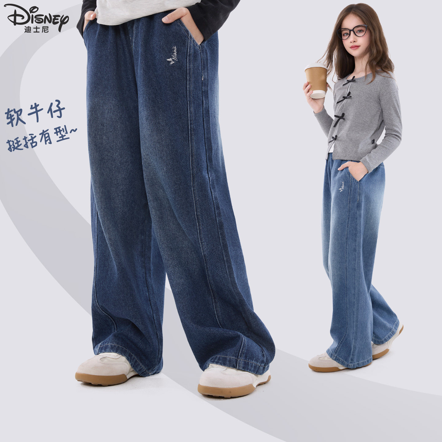 迪士尼女童牛仔裤春装2026新款洋气儿童阔腿裤秋青少年加绒直筒裤