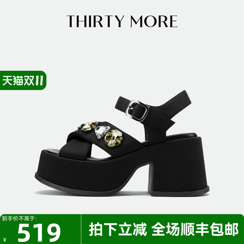 Thirty More厚底凉鞋女2025夏季新款水钻粗跟高跟鞋露趾外穿女鞋