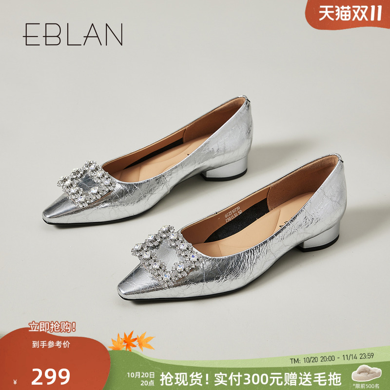 EBLAN/伊伴法式气质水钻粗跟高跟鞋女鞋2025春夏季新款一脚蹬单鞋
