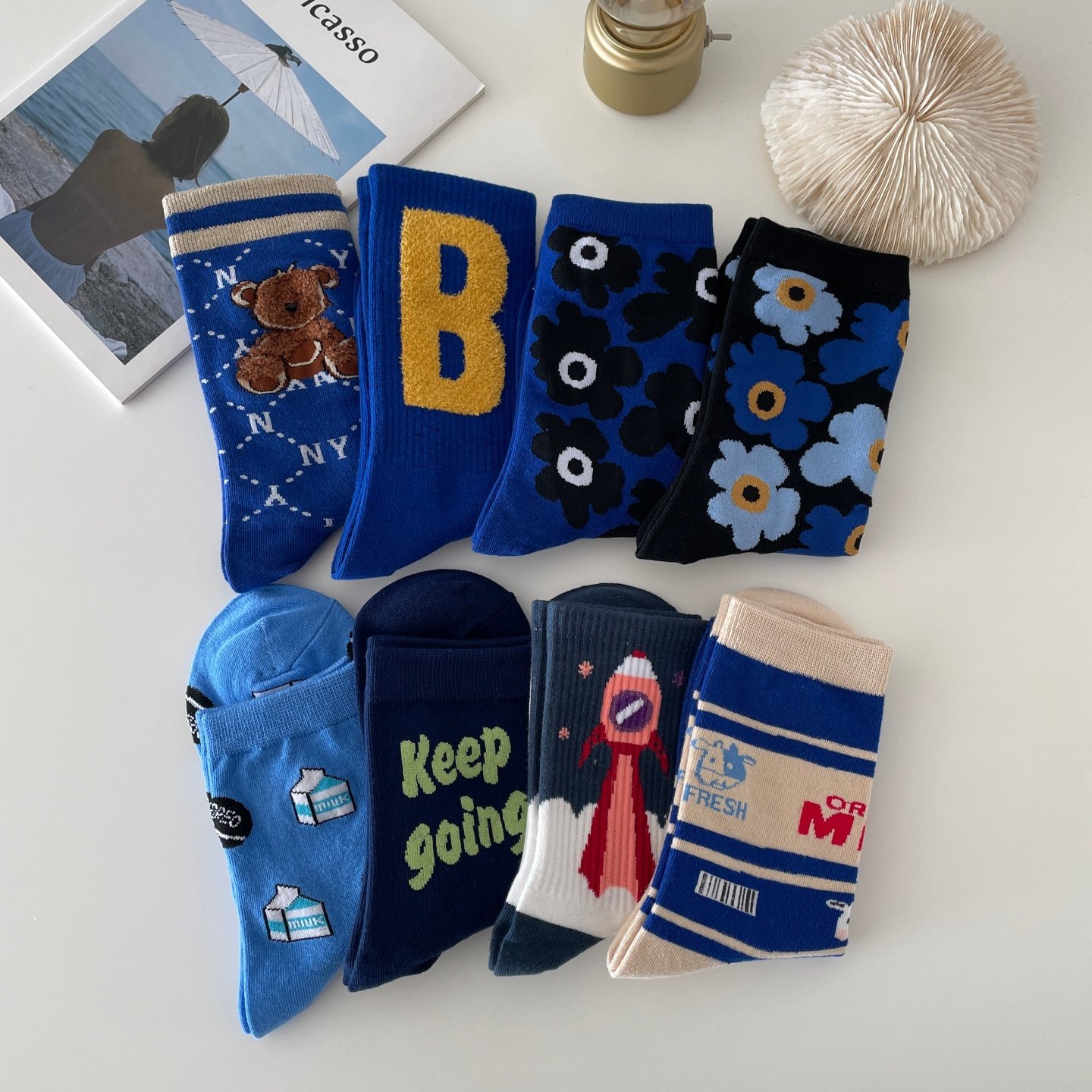 克莱因蓝色卡通袜子女中筒袜ins潮纯棉韩版街头学院风可爱甜美袜