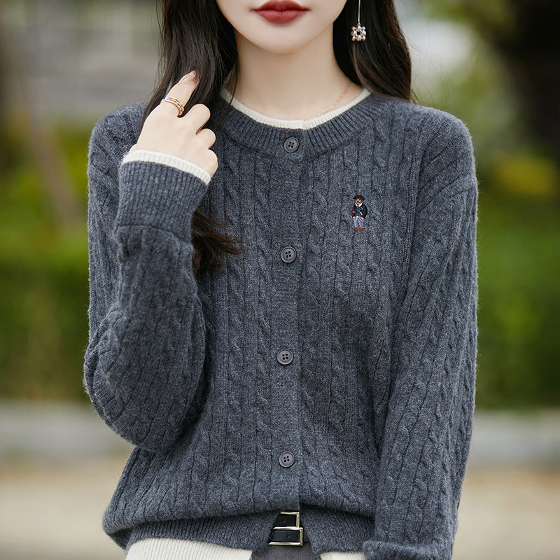 2025秋冬麻花羊绒开衫女圆领宽松针织外套红色毛衣刺绣假两件上衣