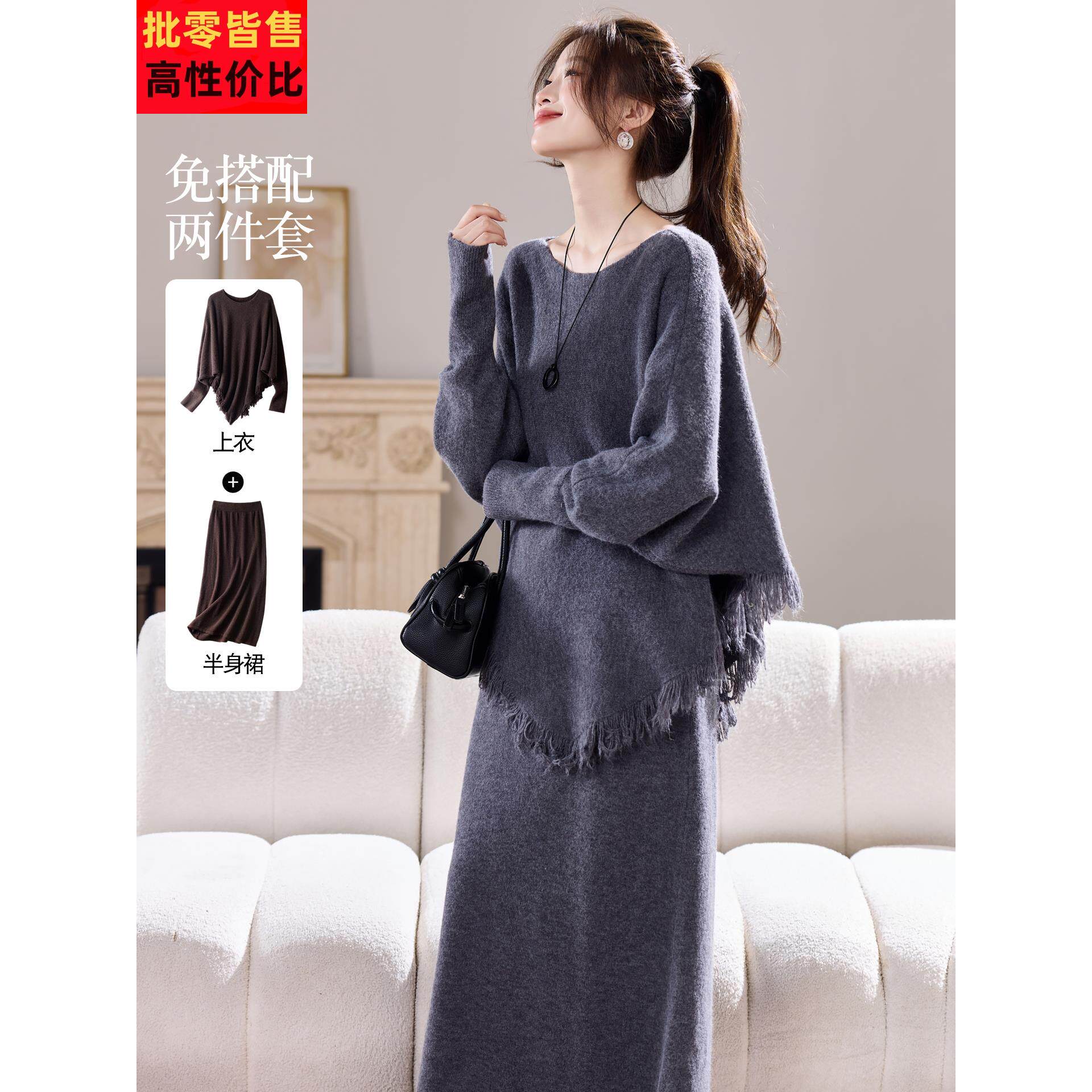 高端精致两件套秋冬高级感40减龄穿搭慵懒风流苏毛衣半身裙套装女