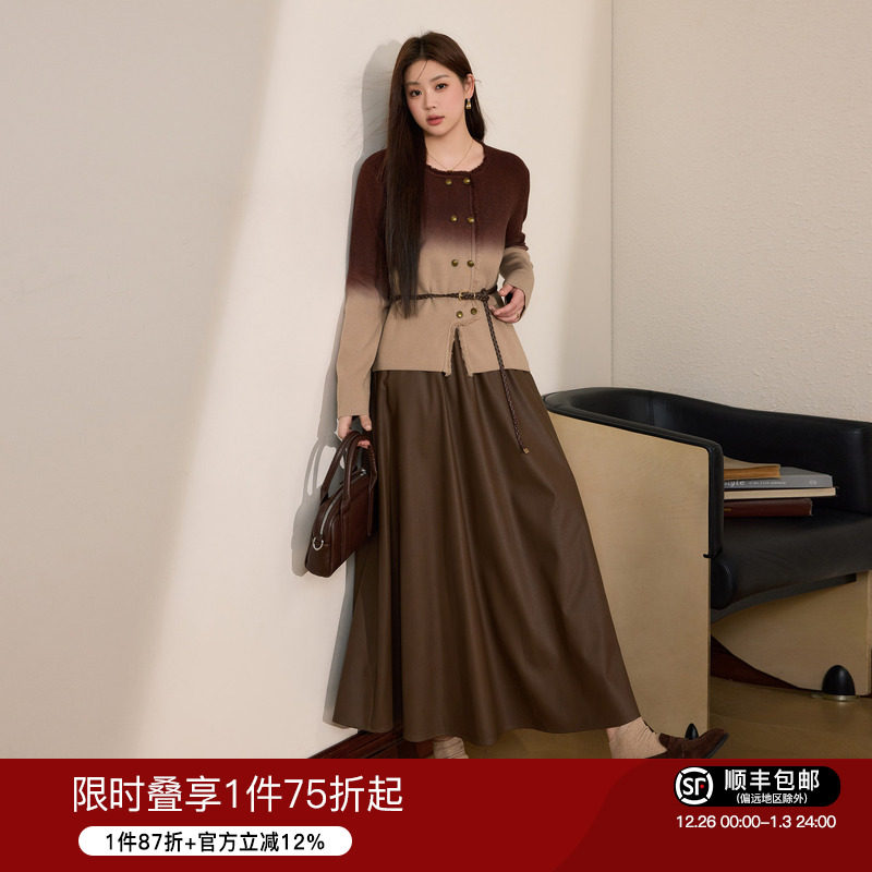 蓝语大码女装法式渐变针织毛衣咖色a字半身裙皮裙2025秋季两件套