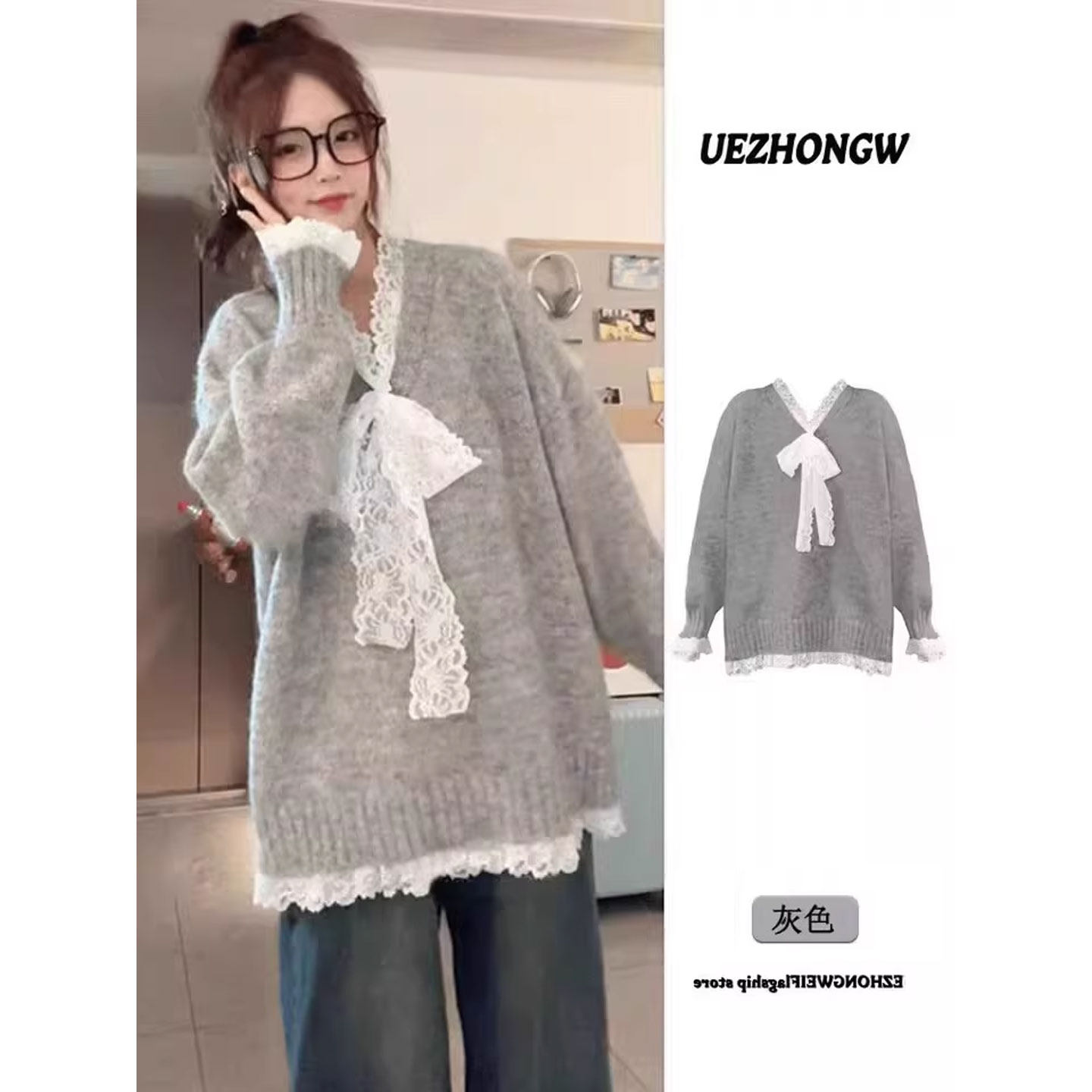 灰色V领套头蕾丝拼接假两件毛衣女秋冬大码宽松慵懒风针织衫上衣