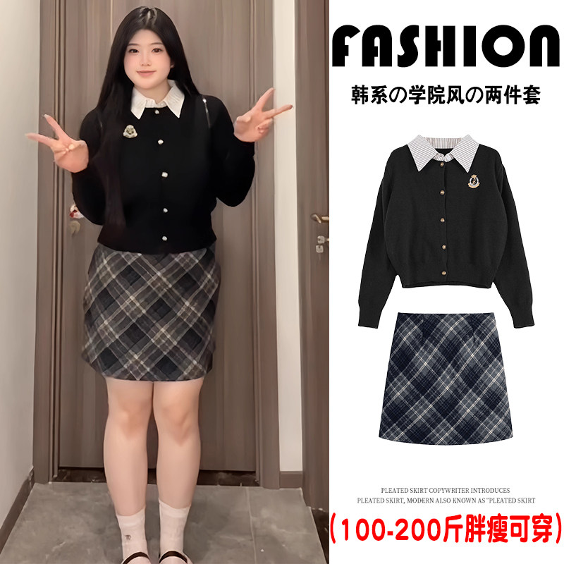 微胖mm大码学院风套装女秋冬假两件拼接针织毛衣上衣+格纹包臀裙