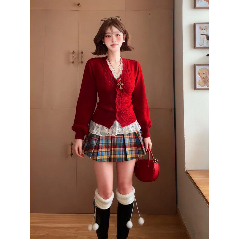 大码胖mm红色毛衣女冬季2025新款外穿内搭蕾丝时尚圣诞穿搭两件套