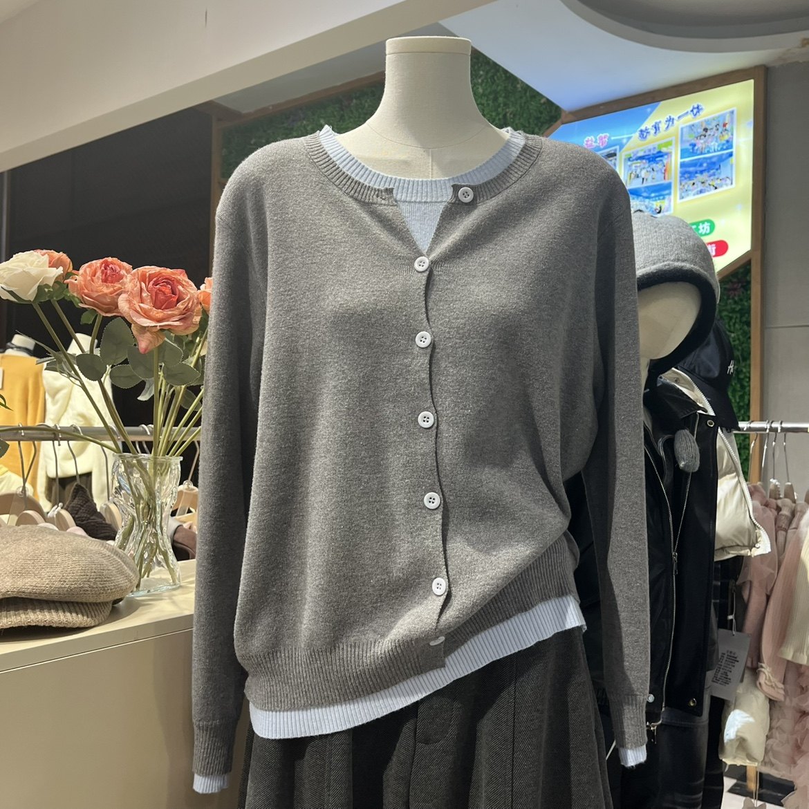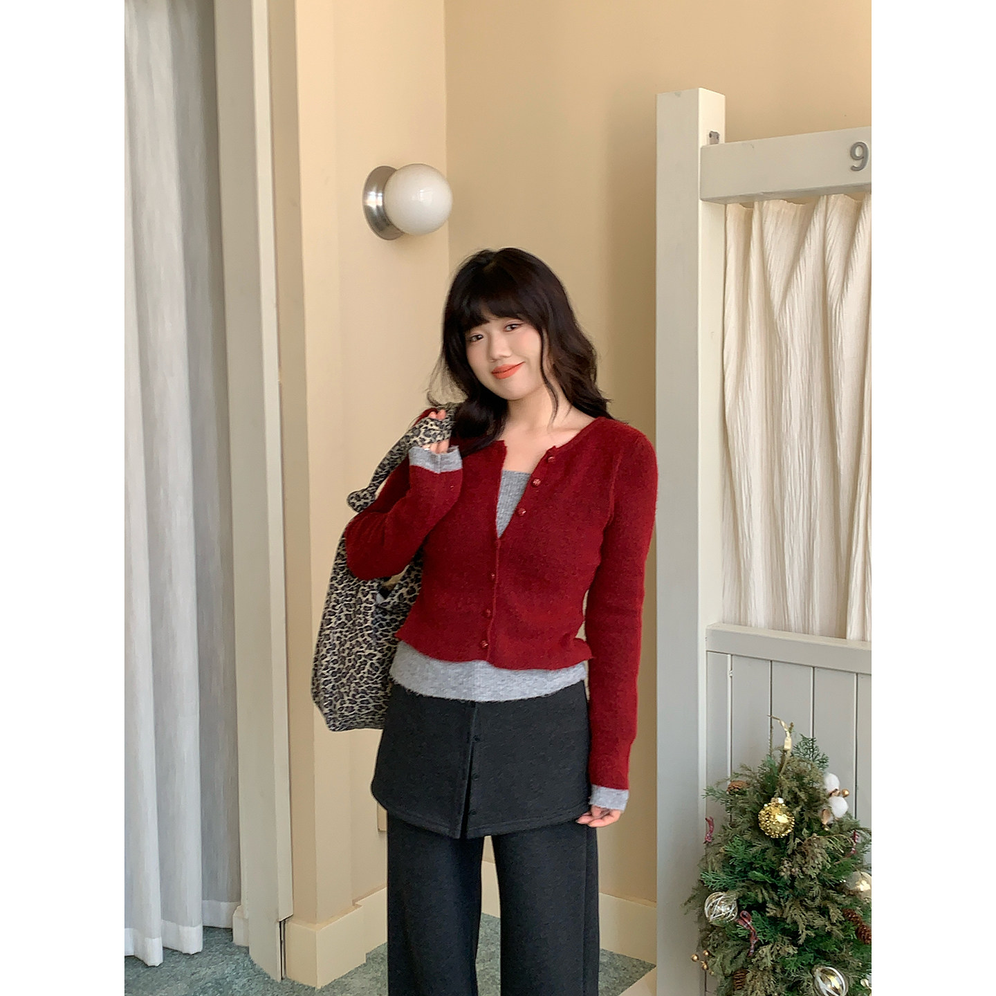 大码圆领安可拉红假两件针织毛衣女早秋胖mm显瘦长袖开衫外套上衣