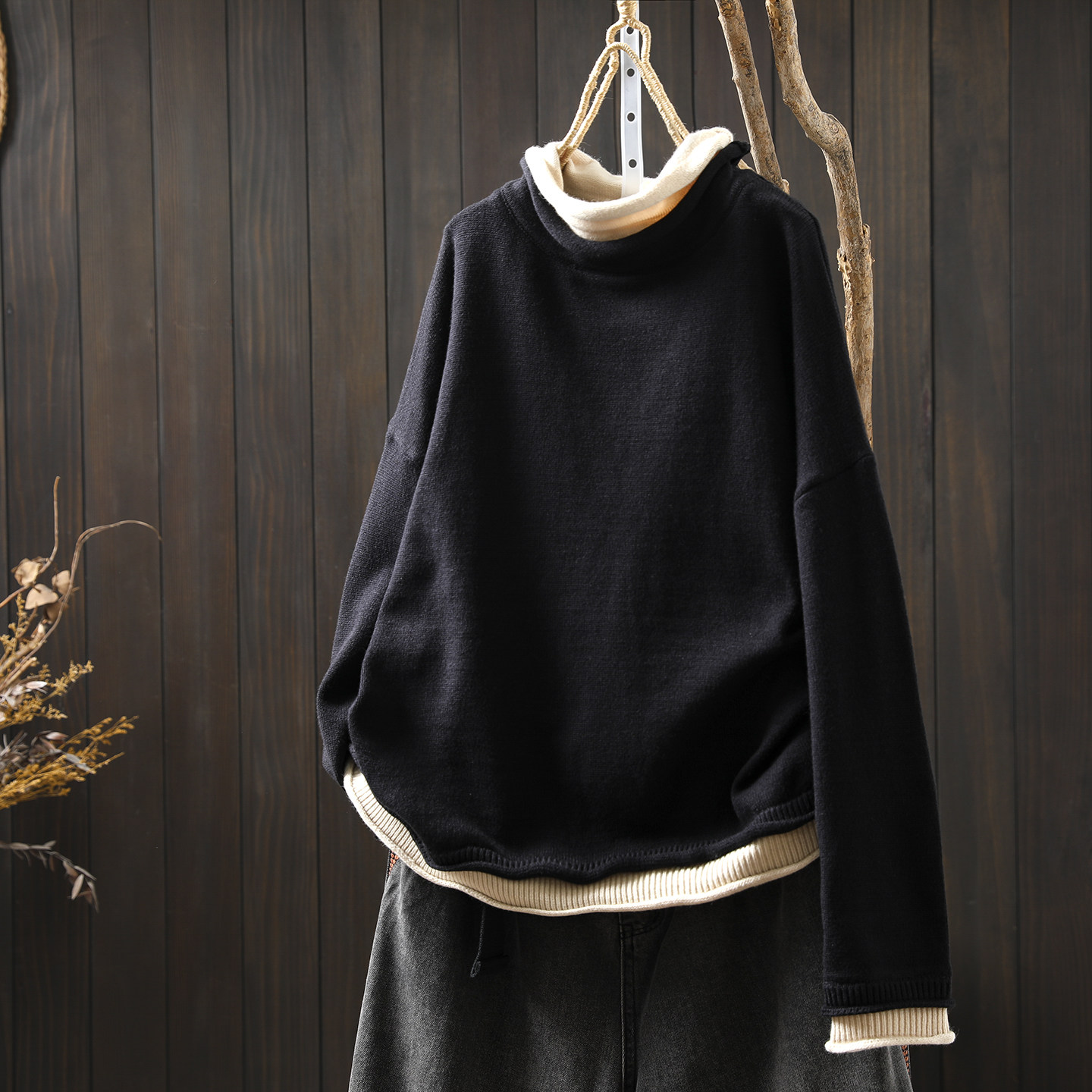 纯棉毛衣女衬衫领假两件套针织上衣全棉宽松大码秋冬打底V领套头