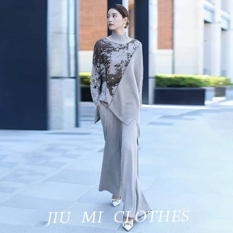 秋冬时尚高端两件套洋气半高领拼色大码高档毛衣上衣阔腿裤两件套