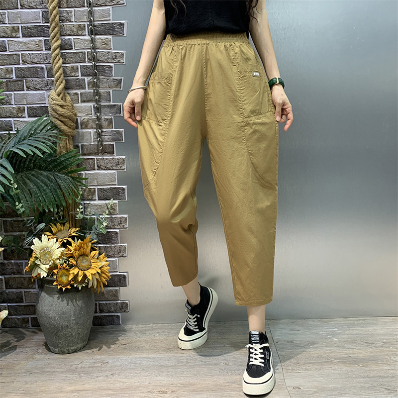 夏季纯棉休闲裤女士水洗棉高腰大口袋全棉松紧腰小脚八分裤哈伦裤