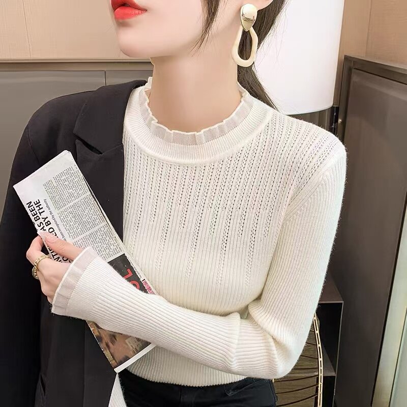 卷边设计羊毛混纺慵懒风小香风百搭常规毛针织衫秋季毛衣纯色圆领