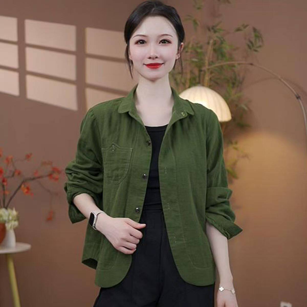 2026春季新款纯色贴布口袋休闲百搭上衣H1棉纱长袖妈妈装衬衫外套