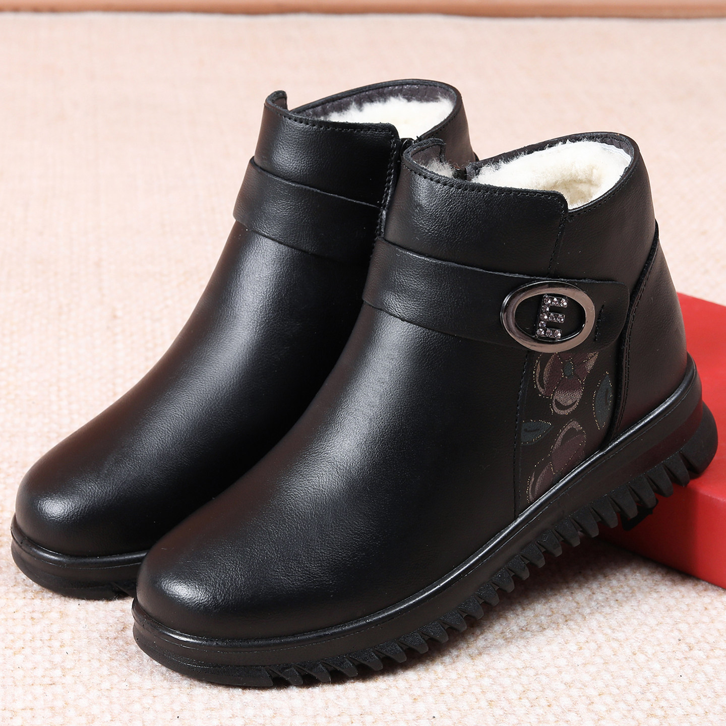 妈妈鞋棉鞋女冬季加绒保暖防滑平底真皮短靴中老年人皮鞋羊毛棉靴