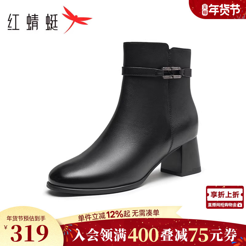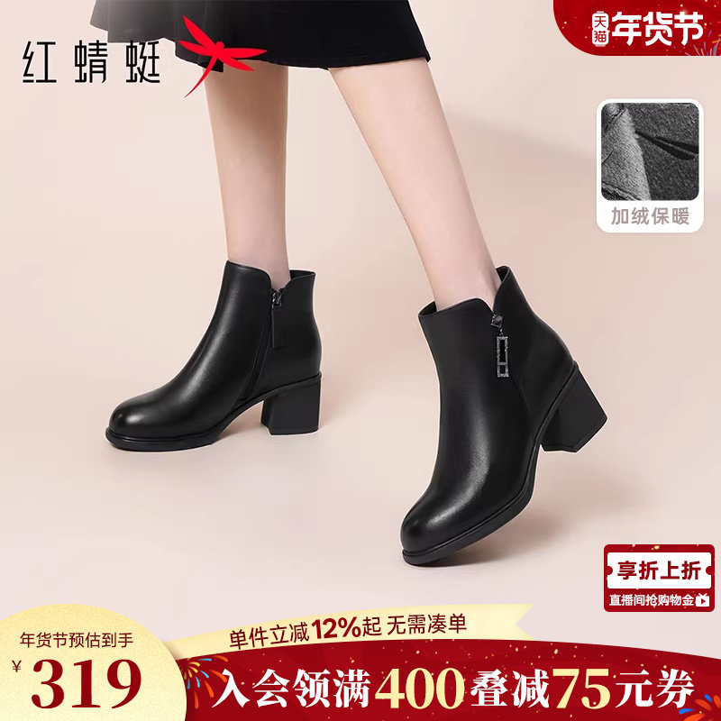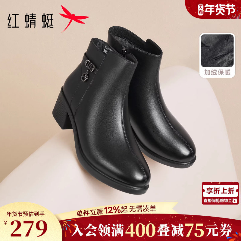 红蜻蜓中年妈妈靴子2025冬靴新款女鞋女士短靴高跟鞋子粗跟皮鞋女