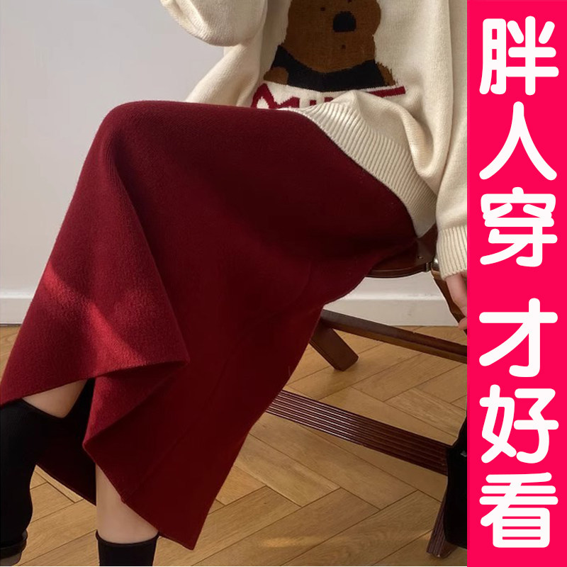 大码胖mm红色半身裙女秋冬中长款包臀裙冬裙包裙遮胯直筒裙一步裙