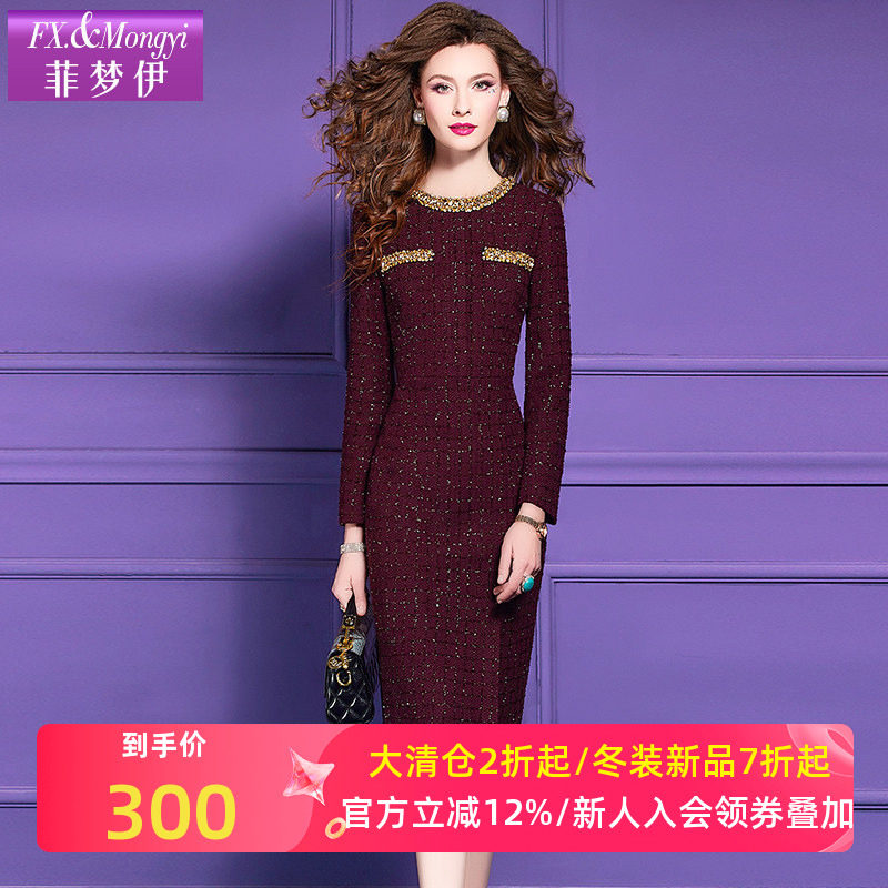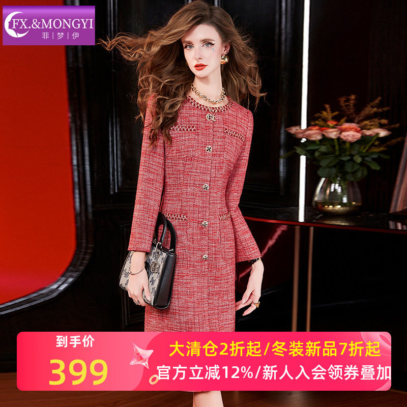 菲梦伊钉珠亮片红色小香风连衣裙女秋季名媛气质粗花呢中长款裙子