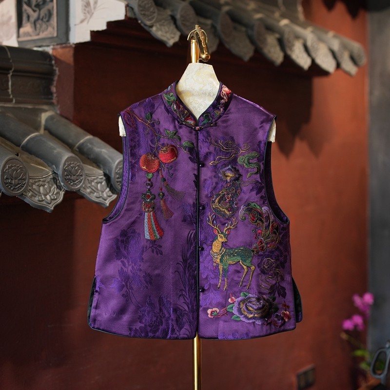 蓝大原创女装重工九色鹿刺绣立领无袖真丝香云纱国潮紫色马甲5915