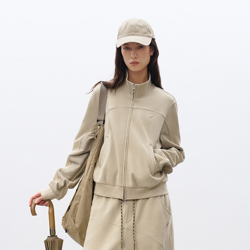 半圆原创女装[运动]2026春季简约休闲宽松两穿立领卫衣外套女套装