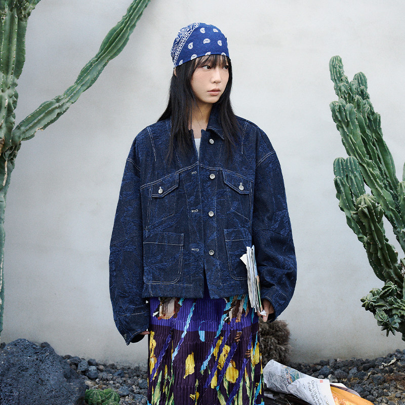 丝绒牛仔提花面料 半圆原创女装[复古]2026春翻领水洗短外套女