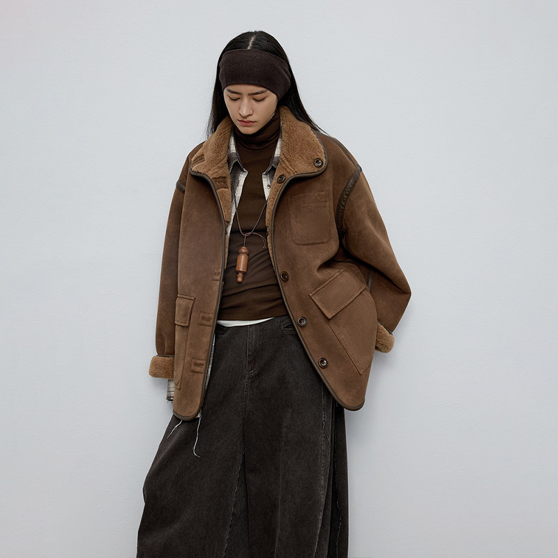 半圆原创女装[复古]2025秋季短款宽松休闲双面穿仿羊羔毛外套女