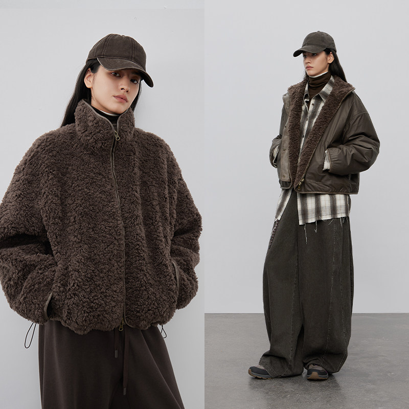 仿羊羔毛面料 半圆原创女装[运动]2025冬双面穿拼接梭织外套女