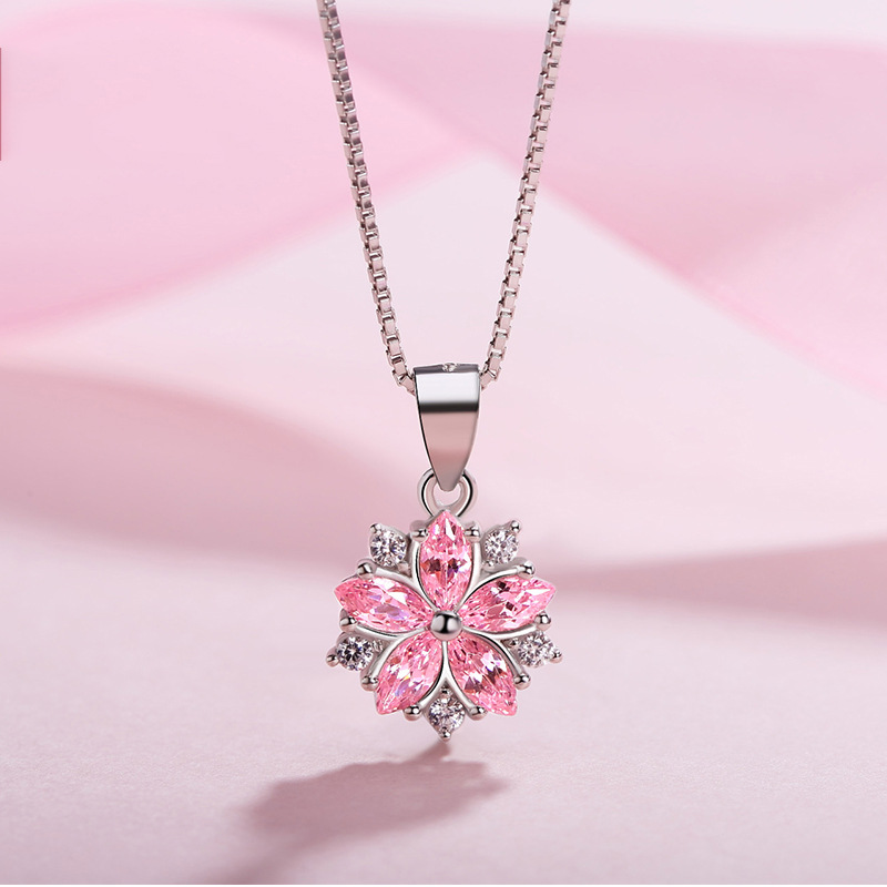 S925银项链女锁骨链粉色小樱花吊坠日韩简约百搭个性配饰生日礼物
