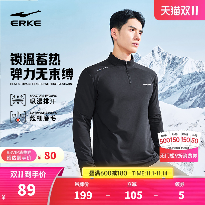 鸿星尔克长袖t恤男秋冬新款男士加绒健身修身运动上衣半拉链卫衣