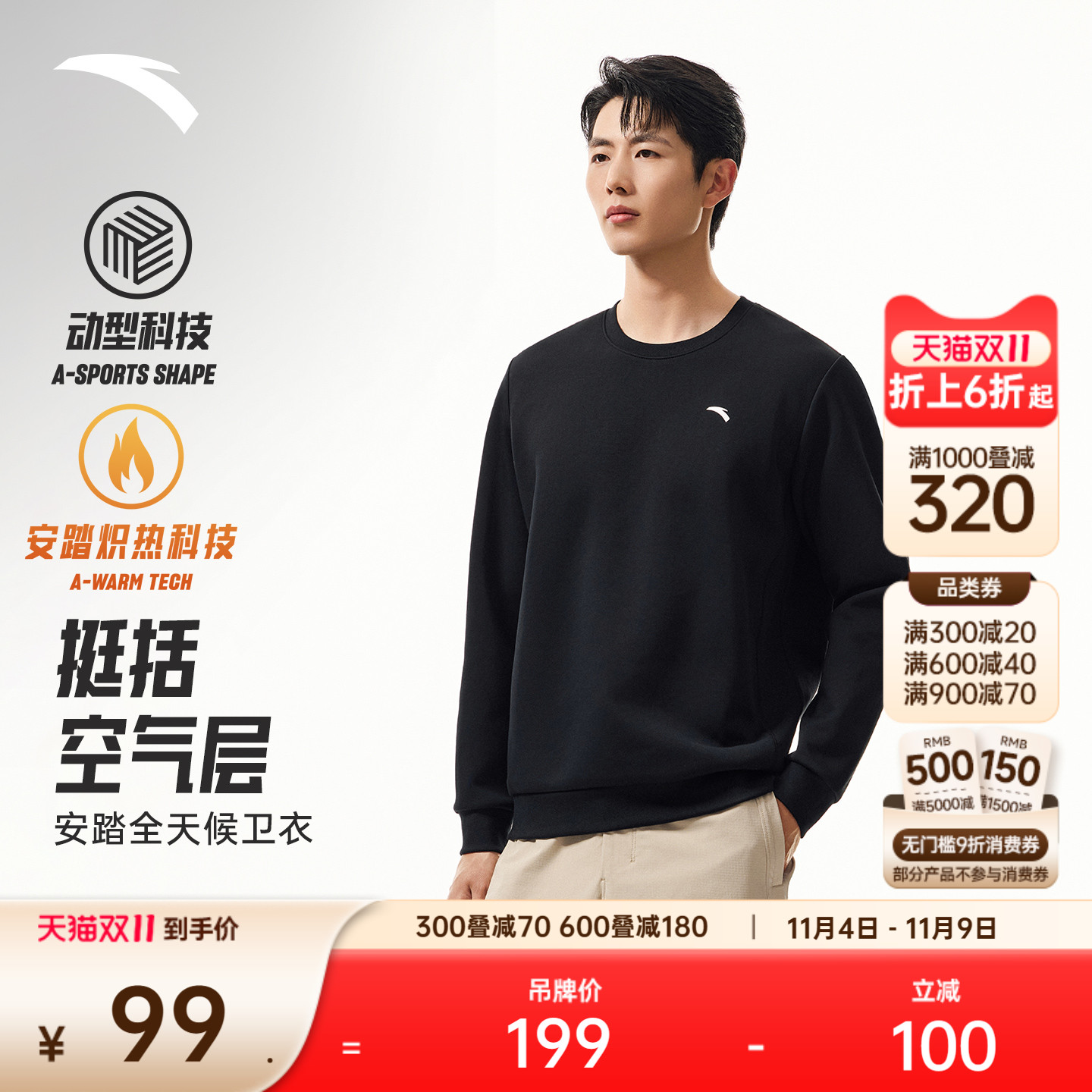 安踏休闲长袖卫衣男冬季加绒圆领套头衫宽松针织运动上衣简约男装