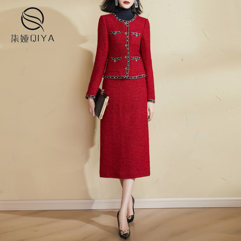 2025新款春季红色时尚套装女羊毛呢子小香风外套半身裙气质两件套