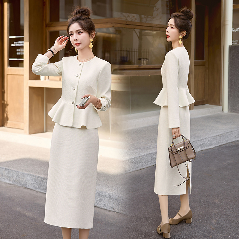 米白色小香风套装洋气减龄春季新款女装收腰商务职场两件套裙正装