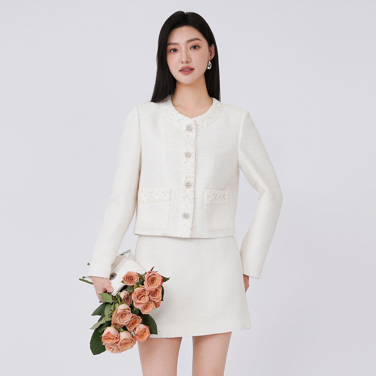 小香风时尚套装女2026春季轻奢小众白色收腰气质上衣半身裙两件套