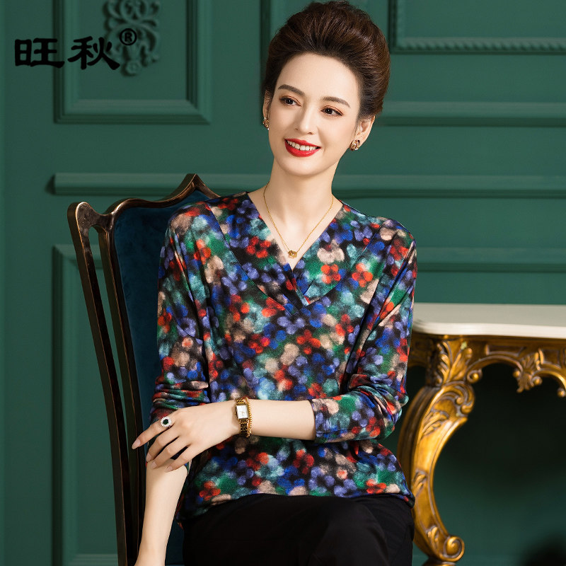 精纺100细羊毛V领针织打底衫女长袖套头薄毛衣内搭宽松印花羊毛衫